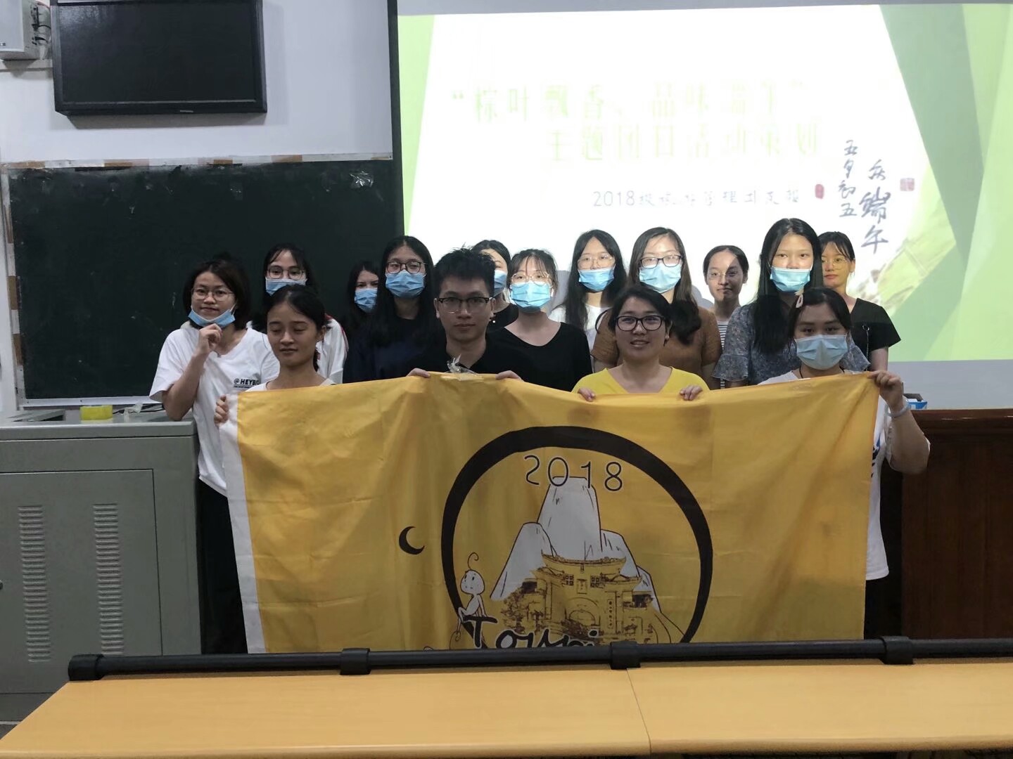 本次活动共分为五个流程。首先,主持人依次介绍到场嘉宾。本次活动很荣幸邀请到了2018级辅导员助理以及2018级旅游管理的班主任来到现场参与。主持人介绍完毕后,全支部成员起立,合唱团歌。之后,班委为本团支部成员分发果冻、小饼干、辣条等小零食。然后,主持人介绍了端午节的相关传统文化,通过知识竞答的游戏模式,全部支部成员参与到活动其中来,加深了对端午节的认识。最后,派发粽子以及艾草香囊作为端午节的纪念礼物并拍照留念,活动结束。