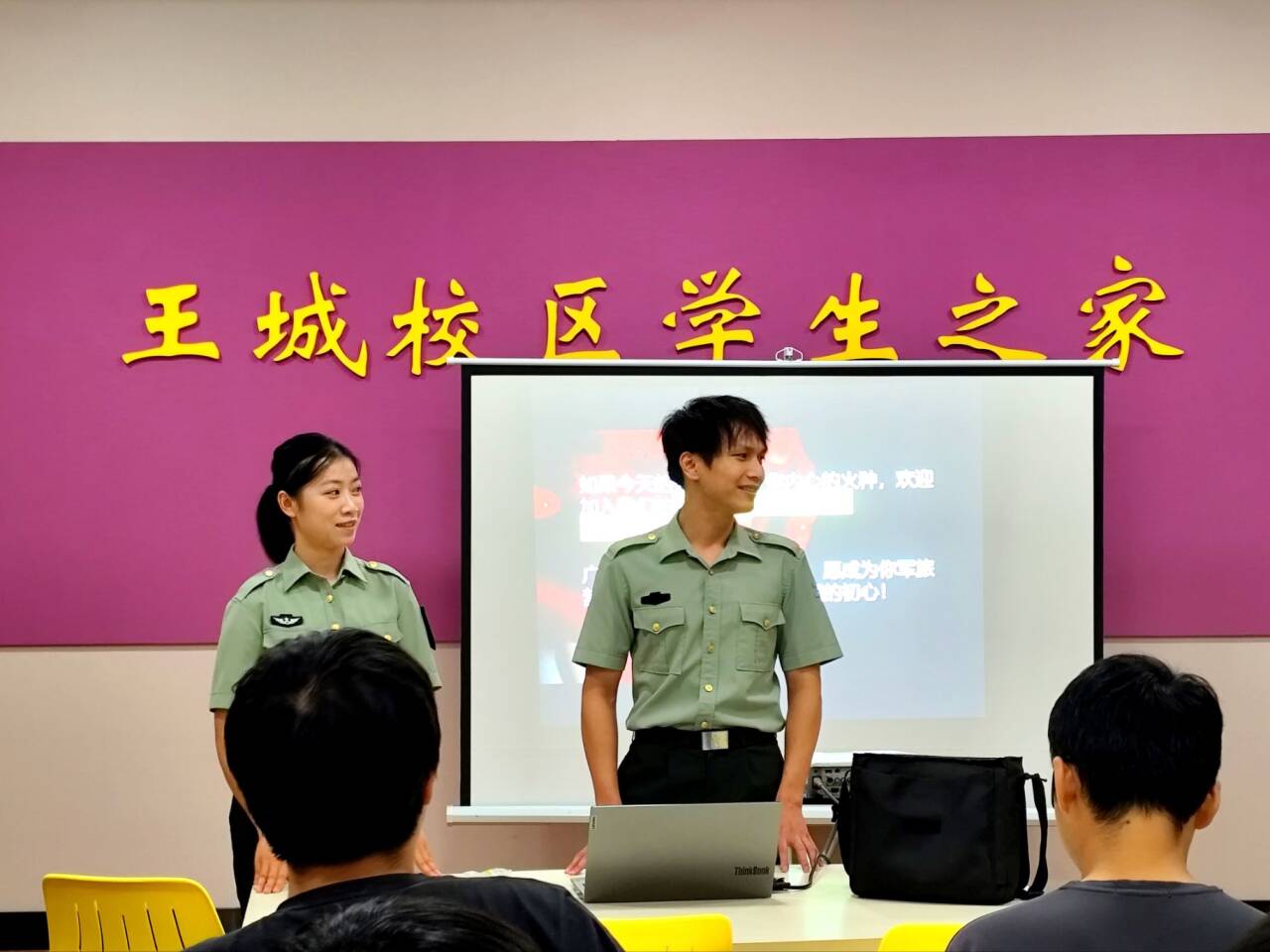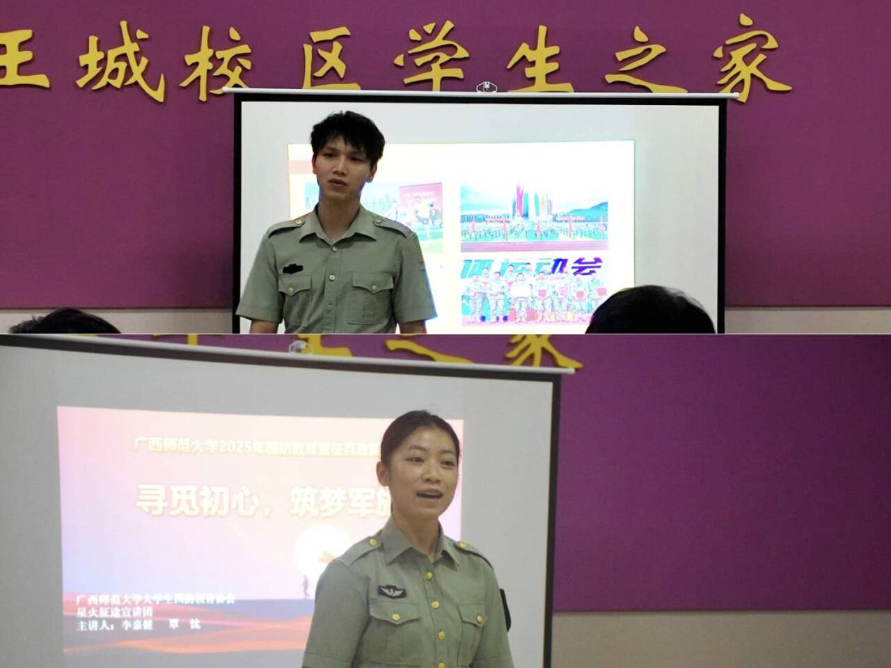 为深入贯彻习近平新时代中国特色社会主义思想,落实习近平总书记关于加强全民国防教育的重要指示精神,9月25日下午,王城校区学生社区开展以“寻觅初心,筑梦军旅”为主题的大学生国防教育暨征兵政策宣讲会,广西师范大学大学生国防教育协会星火征途宣讲团李嘉健、覃忱担任主讲人。