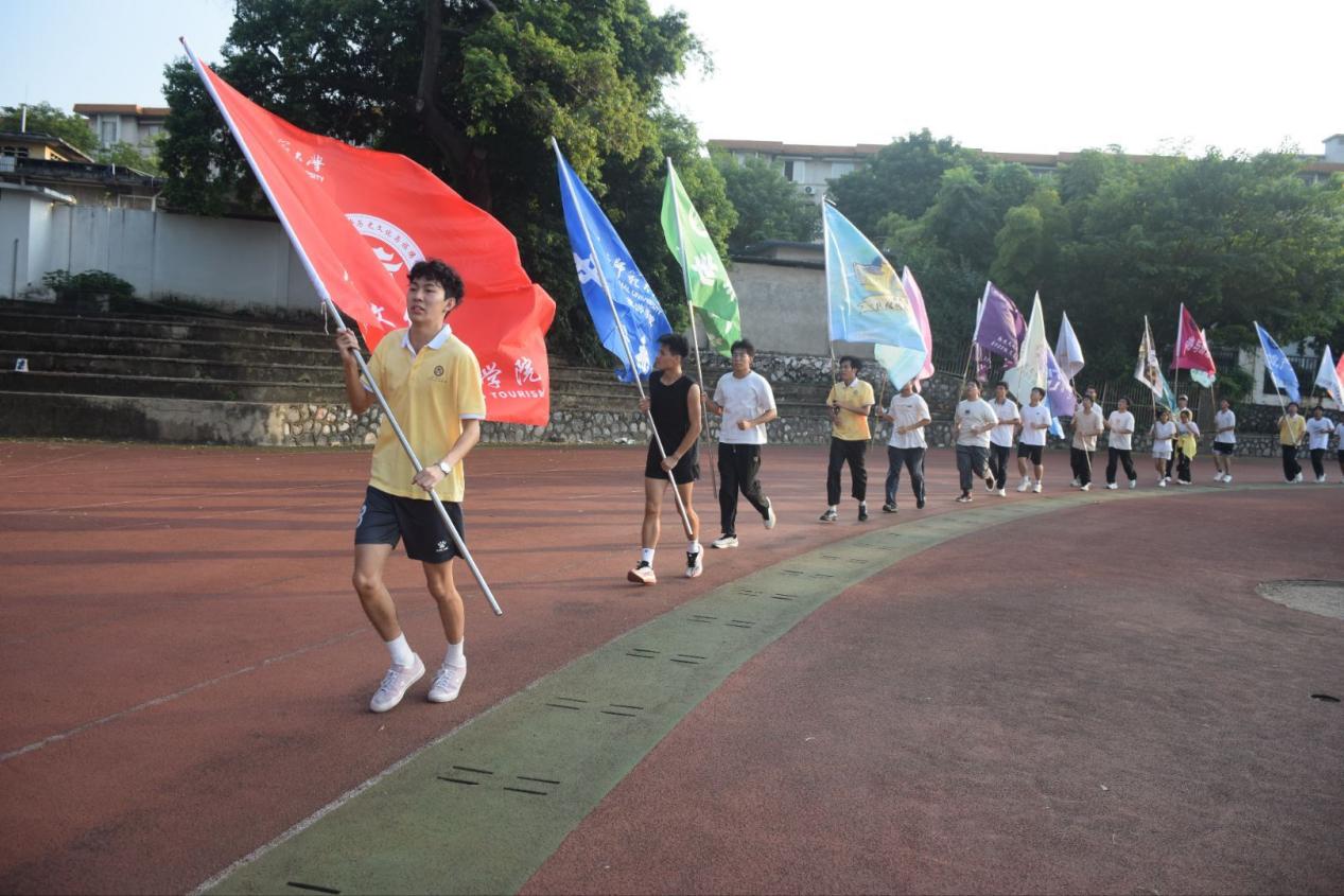 伴随着明快鲜活的音乐响起,两学院舞蹈队以活力舞姿拉开序幕,现场掌声持续不断。随后,国旗方阵、校旗方阵、两学院学生代表团队方阵迈着稳健的步伐依次入场,彰显青春活力。在庄严的国歌声中,全体师生肃立齐唱,表达对祖国的深切热爱与崇高敬意。开幕式上,两学院运动员代表与裁判员代表分别进行宣誓,承诺将恪守规则、公正执裁。最后,历史文化与旅游学院党委书记颜小华郑重宣布田径运动会开幕。