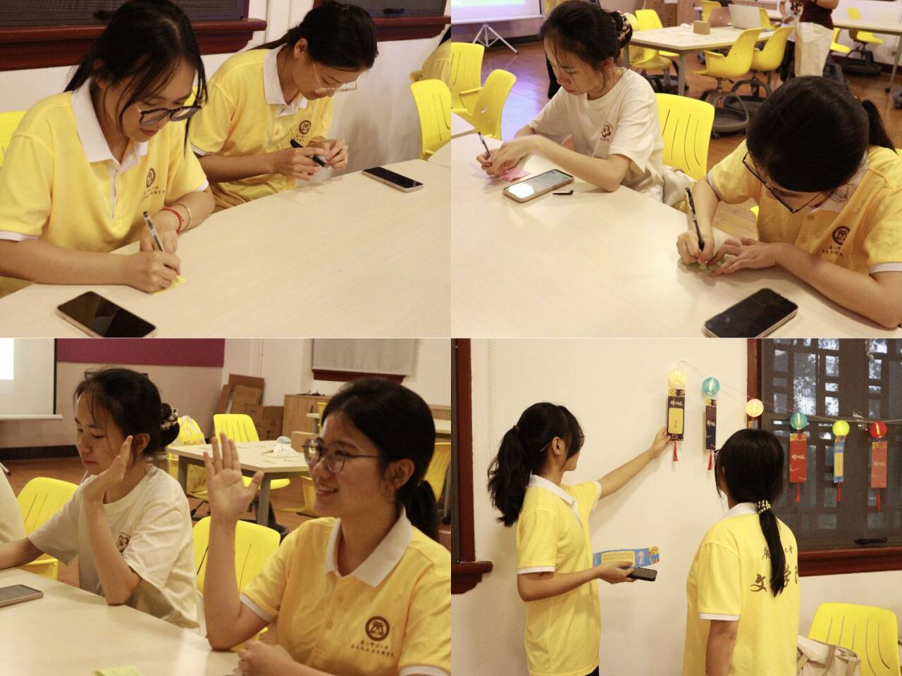 活动过程中,同学们体验到传统民俗的魅力。现场气氛活跃而温馨,欢声笑语不断。活动结束后,同学们纷纷将自己书写的便签张贴到心愿祝福板上,并领取中秋、国庆主题金属挂件等小礼品,本次社区活动在同学们的积极参与下圆满结束。