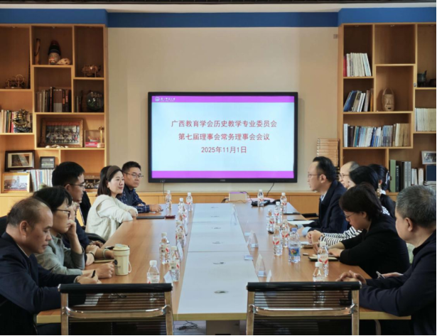 2025年11月1日,广西教育学会历史教学专业委员会第七届理事会第一次常务理事会议,在广西师范大学王城校区召开。这次会议的主要内容是讨论历史专委会在未来三年的工作规划,并邀请《历史教学》编辑部专家作教学研究能力的提升指导。本届理事会的常务理事、文旅学院历史学科教学专业的师生代表共20多人参加了会议。