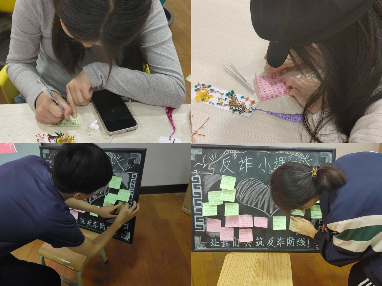 随后在“诈骗反套路留言板”环节,参与活动的学生们纷纷拿起笔,将自己总结的反防诈妙招,用简洁有力的话语生动描绘。一张张留言贴满展板,大家还围绕留言内容相互交流,分享反诈知识,在思想碰撞中进一步强化a反诈意识。