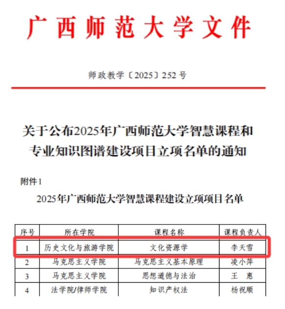 近日,从学校传来喜讯,2025年度“广西师范大学智慧课程和专业知识图谱建设”专项立项名单正式揭晓。我院李天雪老师作为项目负责人申报的《文化资源学》课程经过激烈角逐,成功获批立项。