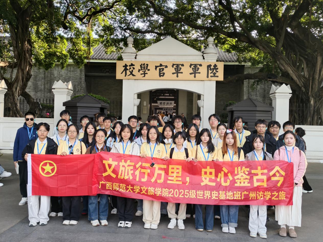 为深化校际学术合作、拓宽学生专业视野,2025年11月21日至23日,广西师范大学历史文化与旅游学院2025级历史学(世界史)基地班(以下简称“历史学基地班”)师生一行赴广州开展校际学术交流活动。此行由学院副院长陈国保教授带队,班主任杨韶杰副教授、辅导员方春露老师共同与全体学生出行,先后与暨南大学、中山大学进行深度对话,并实地参访广东省博物馆、黄埔军校等文化地标,通过学术研讨与文化实践相结合的方式,为学生的专业成长注入新动能。