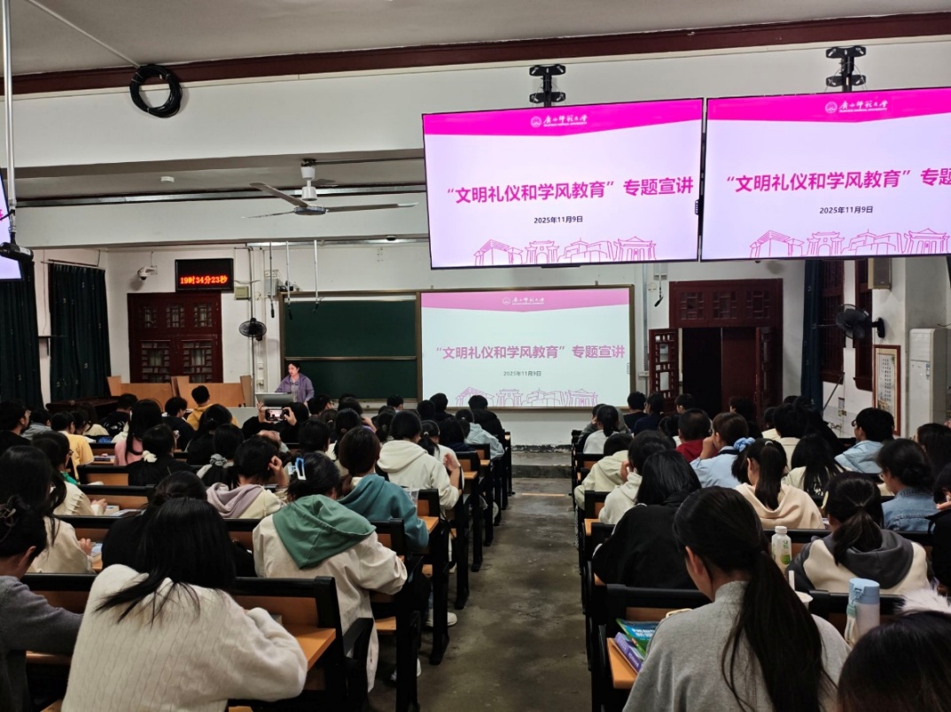 为引导2025级新生适应大学学习生活,树立良好行为规范,营造文明有序的校园氛围,11月9日,广西师范大学历史文化与旅游学院面向全体历史学本科生,组织开展了“文明礼仪与学风教育”专题宣讲活动。