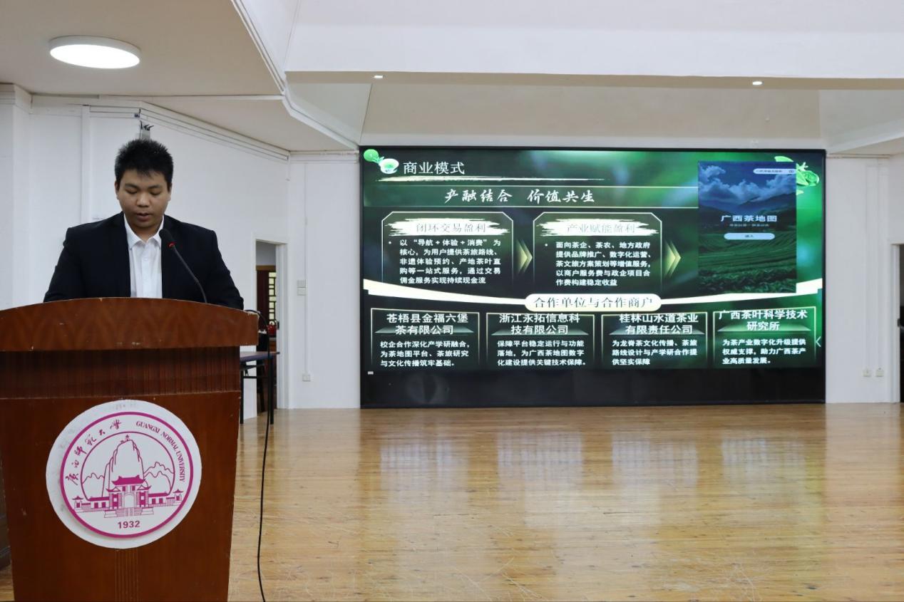在简短而庄重的开场仪式后,比赛正式拉开帷幕。比赛核心环节为项目展示与现场答辩,10个重点项目团队按照抽签顺序依次登台,围绕项目背景、创新亮点及实践成果等内容,结合精心准备的PPT进行为时五分钟的展示,结合评委提问展开答辩,各项目组展现出扎实的学术实践与创新思辨能力。现场气氛紧张而热烈,选手们逻辑清晰、表达流畅,充分彰显了文旅学子锐意进取、勇于探索的精神风貌。