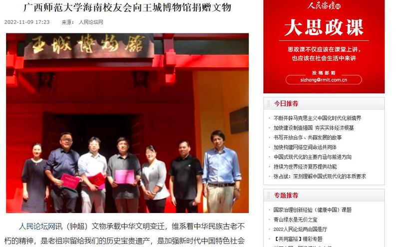11月9日,人民论坛网报道广西师范大学海南校友会向王城博物馆捐赠文物的新闻,人民论坛网是由人民日报社主管的中央重点理论网站,是中国思想理论的门户网站。
