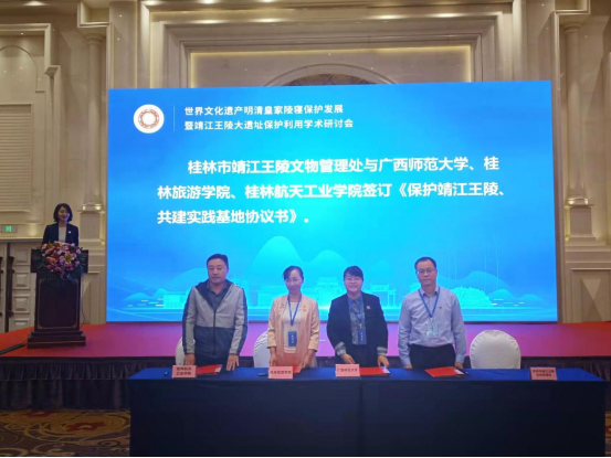 文旅学院党委负责人代表广西师范大学与桂林市靖江王陵文物管理处、桂林旅游学院、桂林航天工业学院共同签订了《保护靖江王陵、共建实践基地协议书》