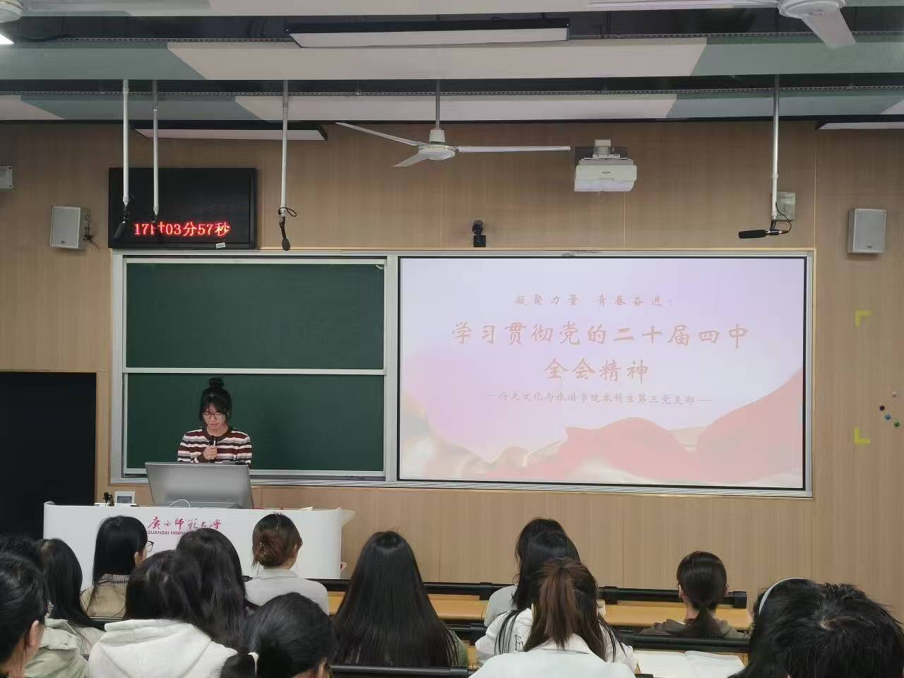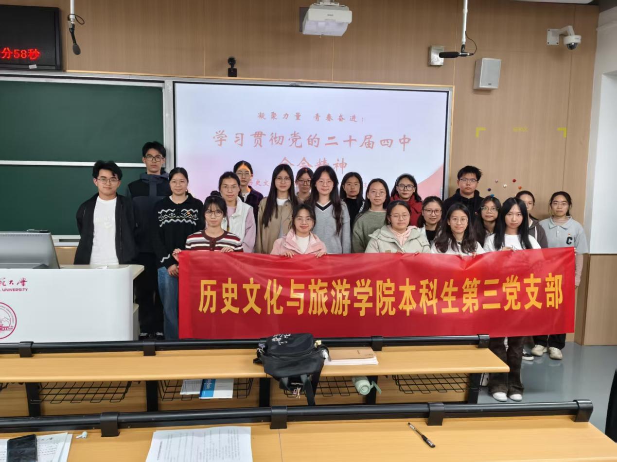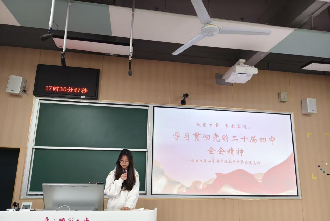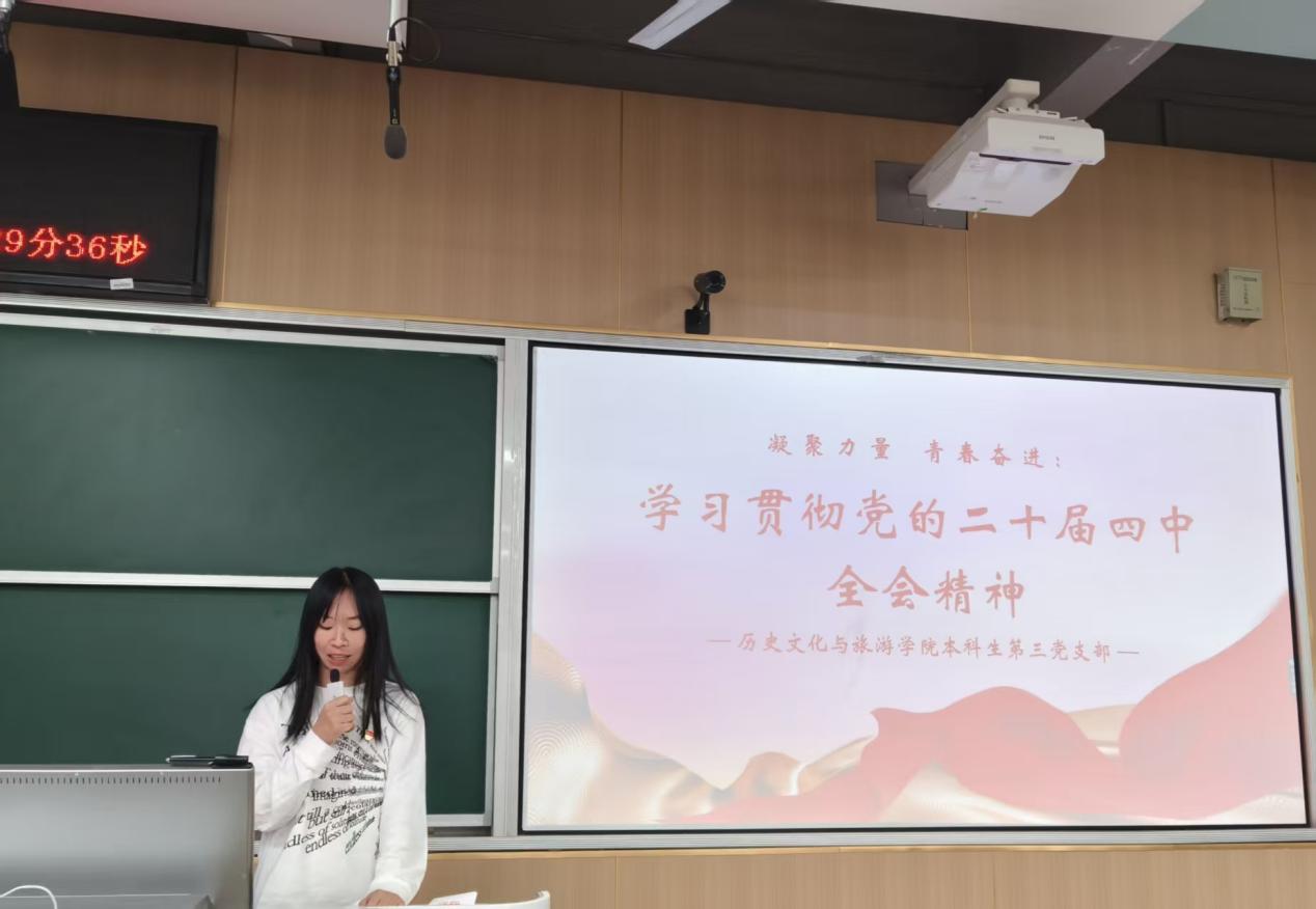 为深入学习贯彻党的二十届四中全会精神,引导青年党员深刻把握中国式现代化的内涵要求,11月28日下午,历史文化与旅游学院本科生第三党支部于王城校区独秀楼开展以“凝聚力量,青春奋进——学习贯彻党的二十届四中全会精神”为主题的党日活动。党支部书记常诗悦老师主持本次会议,支部全体党员、预备党员及发展对象共同参与。