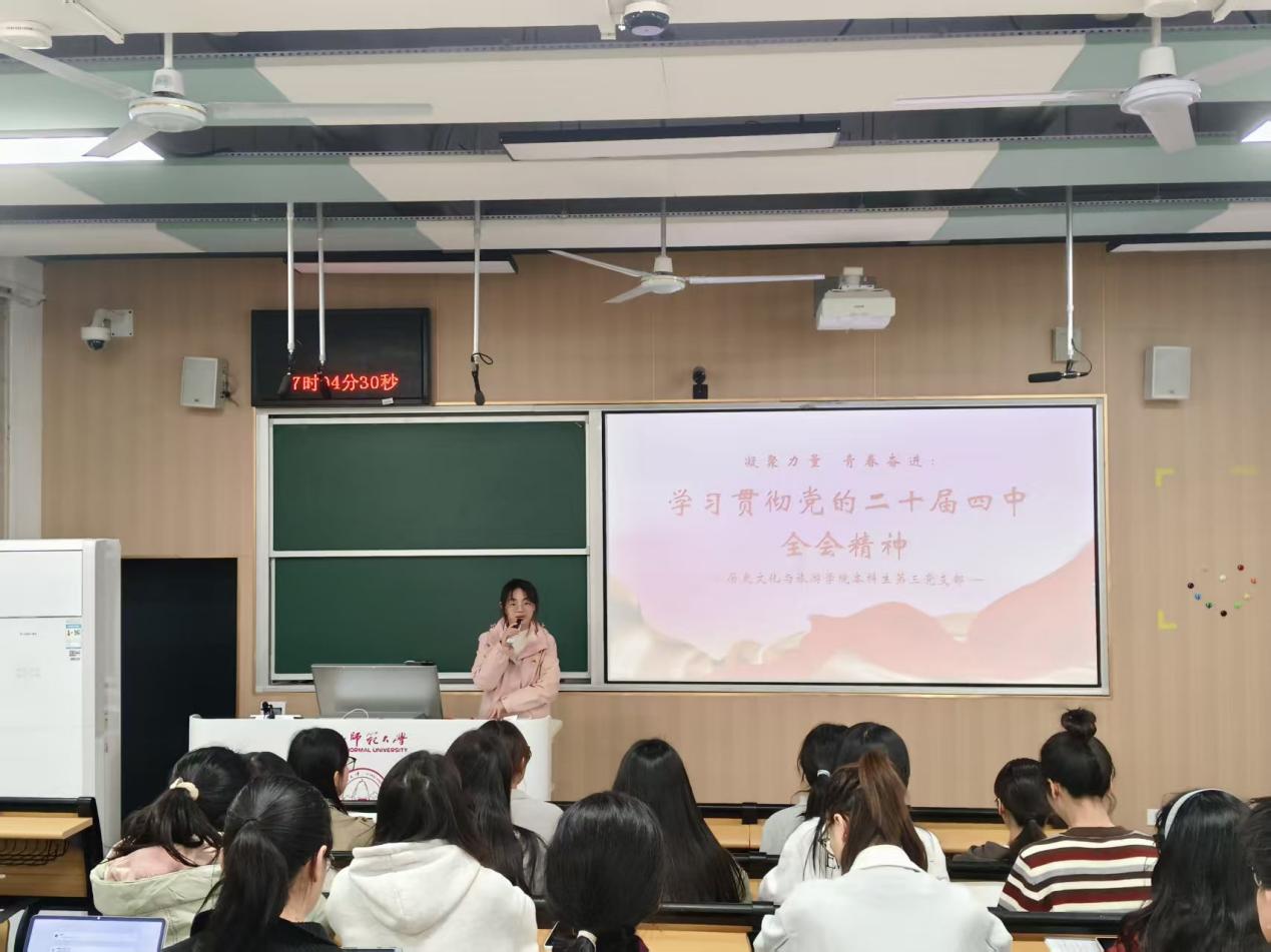 会议伊始,由韦彩味同志介绍本次活动流程。随后,常诗悦老师讲授微党课。她提到,党的二十届四中全会是在我国迈上全面建设社会主义现代化国家新征程的关键时刻召开的一次重要会议,要求全体党员将学习贯彻全会精神作为当前首要政治任务,准确理解其核心要义与实践要求,自觉把个人追求和规划融入党和国家事业发展的宏伟蓝图中,锤炼过硬本领,担当时代重任。