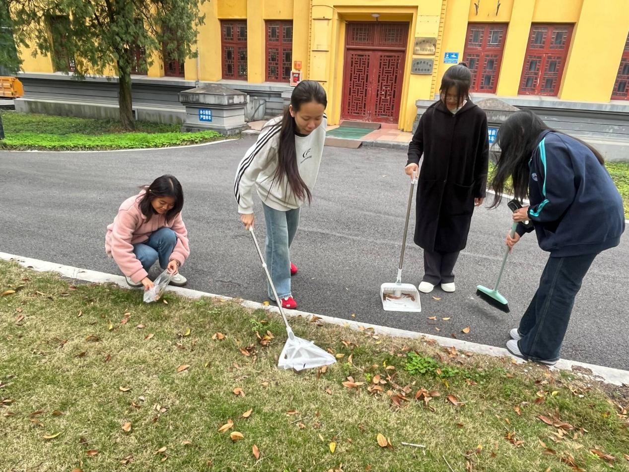 班级成员们认真清扫地上的落叶