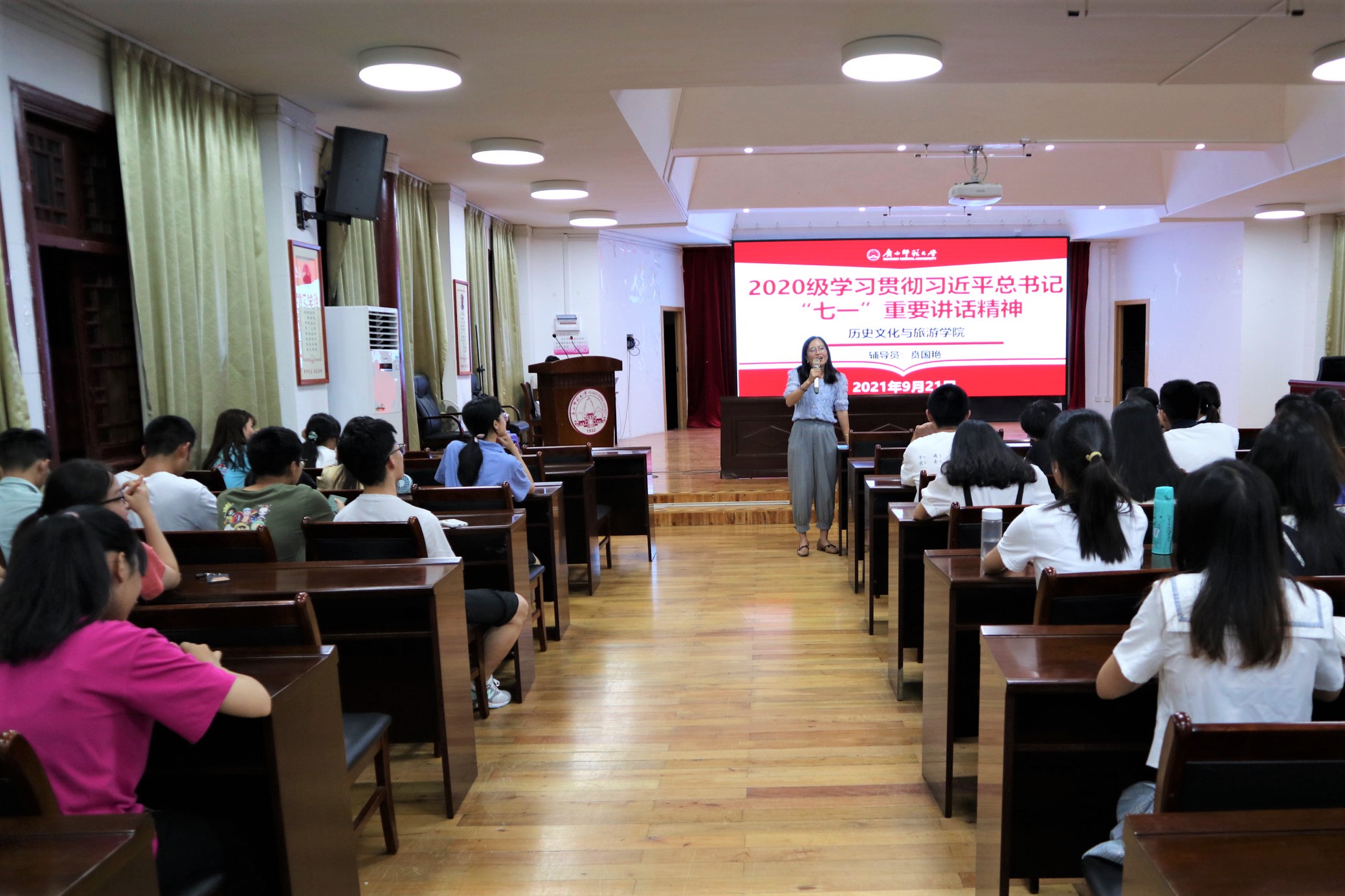 方向决定前途,道路决定命运。为深刻阐明党和国家发展的一系列全局性、根本性、战略性问题,2021年9月21日晚20时,历史文化与旅游学院在王城校区演艺厅召开“学习贯彻习近平总书记‘七一’重要讲话精神”主题会议,会议由2020级辅导员主持,2020级全体本科生参加本次会议。