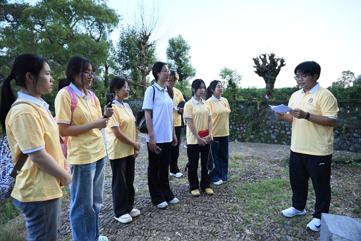 随后,师生前往江头村继续研学。作为周敦颐后裔聚居地,村中爱莲家祠承载爱莲文化,周氏家族将《爱莲说》“出淤泥而不染”精神融入家训,刻于楹联、浮雕,设学堂教子弟诵读。本科生第三党支部党员代表冯鹏在厨字塔前讲授微党课,结合古村廉洁故事与自身感悟,为同学们解读传统家风与当代廉洁教育的内在联系。漫步古村,明清建筑的雕梁画栋、碑刻题字诉说廉洁故事,学生骨干岳雨霏同学坦言:“走在江头村,才知廉洁融入生活细节,习近平总书记倡导的‘莲花精神’在此得到真实诠释。”过程中,同学们围绕研学所得展开热烈分享。
