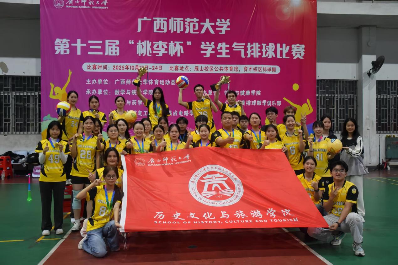 为积极响应学校“文体并举、全面育人”的号召,丰富校园体育文化生活,搭建高校排球竞技交流平台、弘扬顽强拼搏的体育精神,2025年广西师范大学第十三届“桃李杯”学生气排球决赛近日在雁山校区公共体育馆圆满落幕。我院排球代表队凭借过硬实力与默契协作奋勇争先,最终斩获女子组第一名以及混合组第二名的亮眼成绩,以文体并举的风采为学院争光!