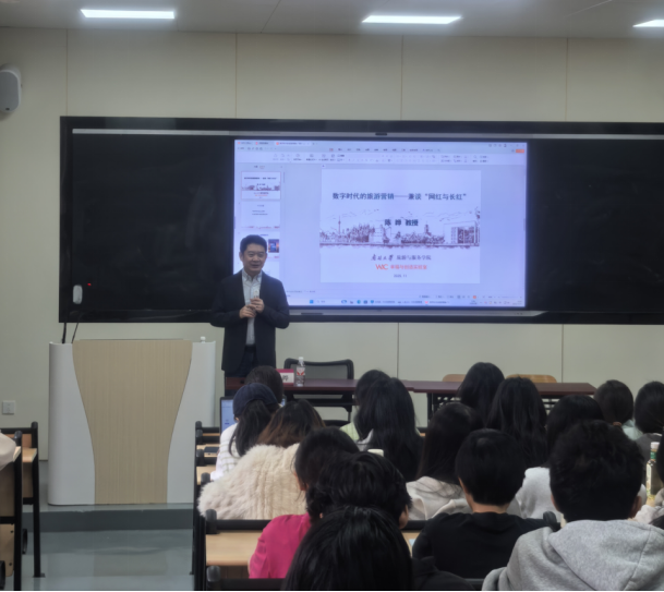 陈晔教授长期深耕旅游营销领域,具备深厚的学术积淀与丰富的实践经验。讲座中,他围绕数字时代旅游营销的核心变革展开讲解,系统分析了数字化浪潮对旅游行业营销模式、传播路径及用户需求带来的深远影响。针对当下热门的“网红现象”,陈教授结合典型案例,深入剖析了新营销系统的构建逻辑,探讨了旅游目的地如何平衡“网红效应”与“长红发展”,为在场师生呈现了兼具理论深度与实践价值的行业洞见。