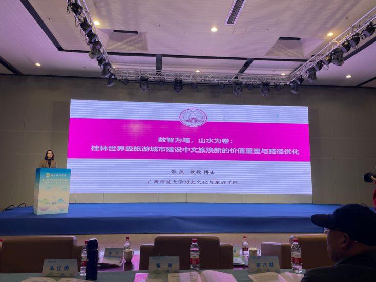 11月21日上午,第二届世界级旅游城市与桂林经典主题学术交流会在桂林旅游学院顺利举行。本次会议由桂林市委宣传部指导,桂林旅游学院主办,市世界级旅游城市建设促进局、市社会科学界联合会协办。广西师范大学历史文化与旅游学院张燕教授受邀参会并以 “数智为笔,山水为卷:桂林世界级旅游城市建设中文旅焕新的价值重塑与路径优化” 为题发表主旨发言。